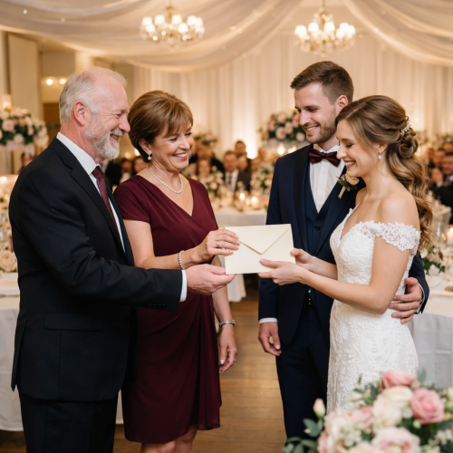 Настал момент подарков. Родители Романа вышли вперёд, произнесли торжественную речь и передали молодожёнам плотный конверт с деньгами.